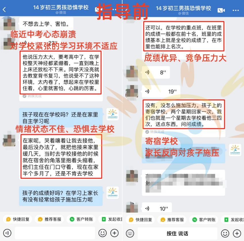 前段时间我们这边就接待了类似情况的孩子,孩子妈妈反映,自家孩子学习不错,一直在重点班,甚至全市也能排上名次。但在临近中考的前几个月,孩子开始害怕上学、恐惧学校,状态非常消极。