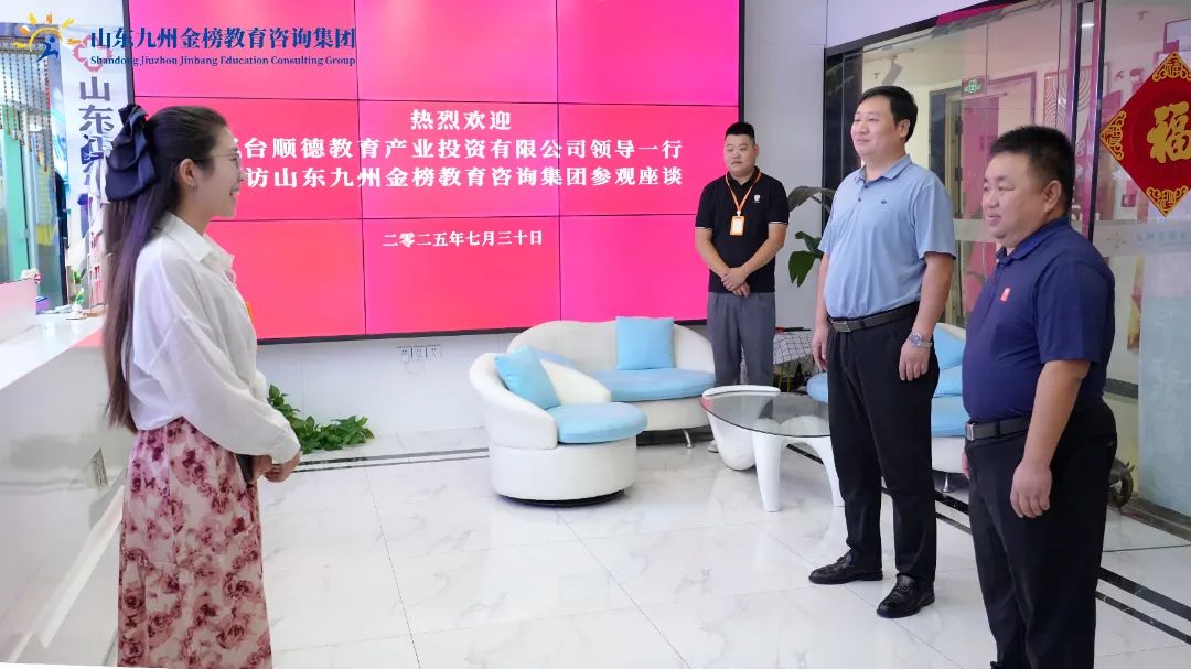 7月30日,邢台顺德教育产业投资有限公司经理顾书磊、 副经理张瑞涛一行到访山东九州金榜教育咨询集团(简称九州金榜家庭教育)参观调研并开展座谈。旨在深入探讨家庭教育服务领域的发展现状,共同推动家庭教育服务产业的生机与创新。九州金榜家庭教育行政部总监高扬等领导陪同调研并参加座谈。