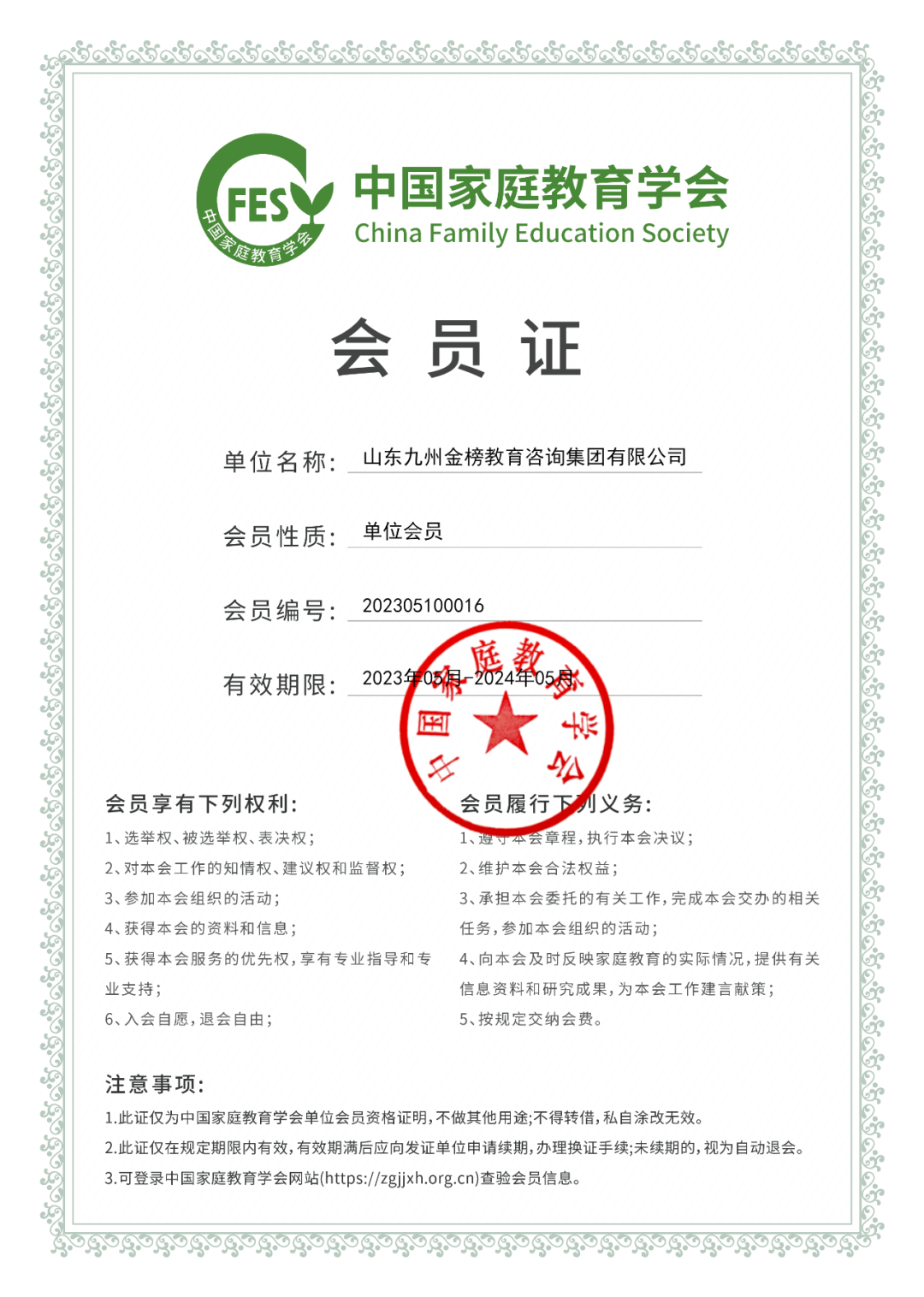 近日,经中国家庭教育学会严格审核与选拔,山东九州金榜教育咨询集团荣膺中国家庭教育学会会员单位!